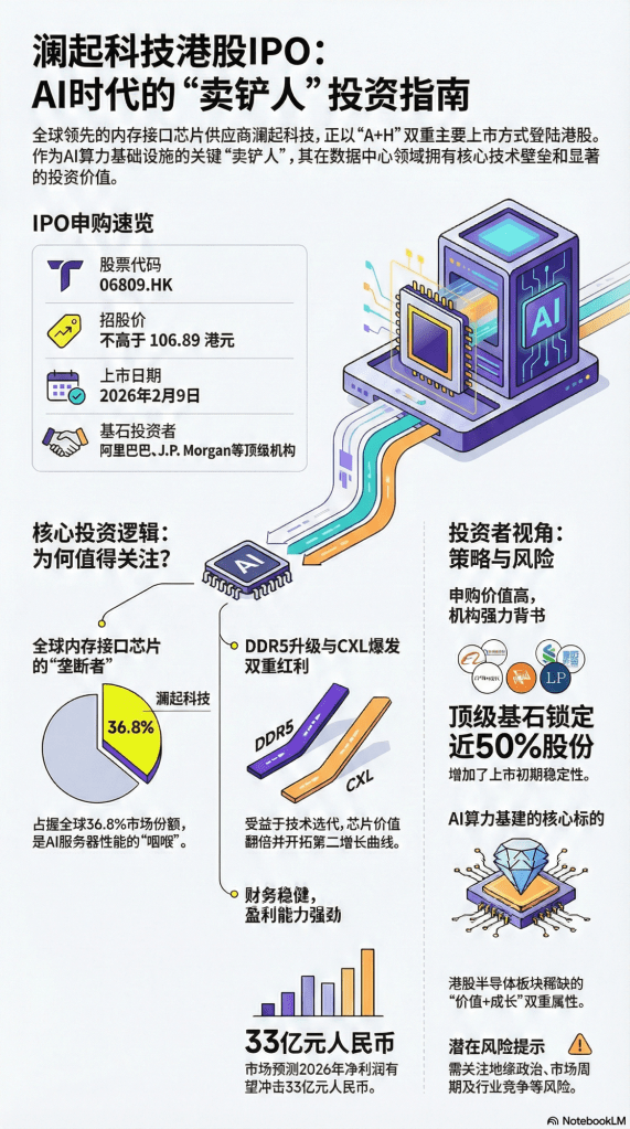 一、 申购信息要点 (IPO Summary) 指标 关键数据 股票代码 06809.HK(A股代码:688008.SH) 招股价 不高于 106.89 港元 入场费 10,796.80 港元 (每手 100 股) 上市日期 2026年2月9日 募资规模 拟募资约 70.43 亿港元 基石投资者 顶级豪华阵营:阿里巴巴、J.P. Morgan (JPMIMI)、瑞银资管 (UBS AM)、云锋基金等,锁定了近 50% 的发售股份。 募集用途 70% 用于互连芯片(DDR5/PCIe/CXL)研发,深耕 AI 基建赛道。 二、 核心投资逻辑:为什么它是 AI 时代的“刚需”?