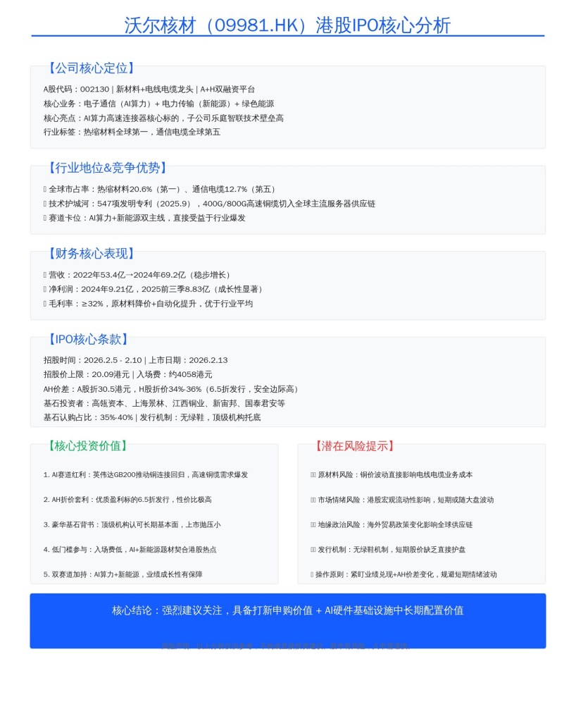 沃尔核材(股票代码:09981.HK)目前正处于港股招股阶段。作为一名专业投资者,我将从公司背景、行业地位、财务表现、IPO条款以及投资价值五个维度为你深入分析。